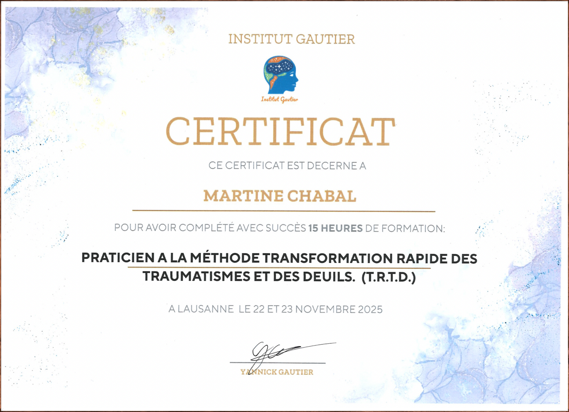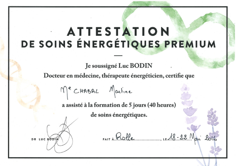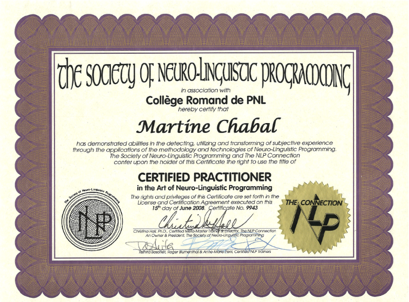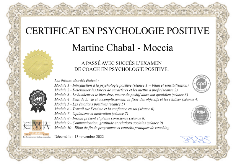 Je me suis également formée en PNL (programmation Neuro-linguistique) et comme coach en psychologie positive, j'inclus naturellement ces approches dans mes soins et accompagnements, selon les besoins.